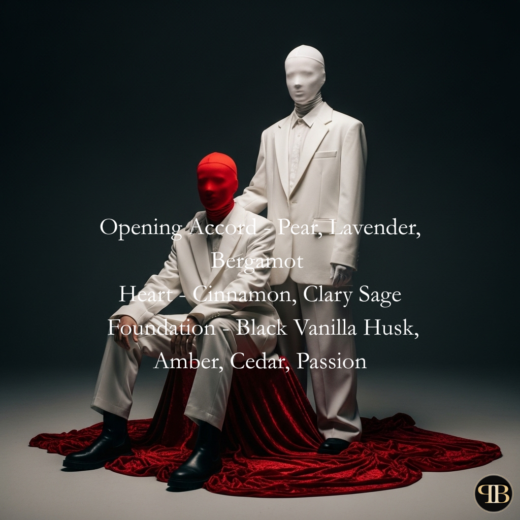 A playful yet seductive blend of pear, lavender, and bergamot, spiced with cinnamon and clary sage, and anchored by black vanilla husk, amber, and cedar. Bold, passionate, unforgettable.